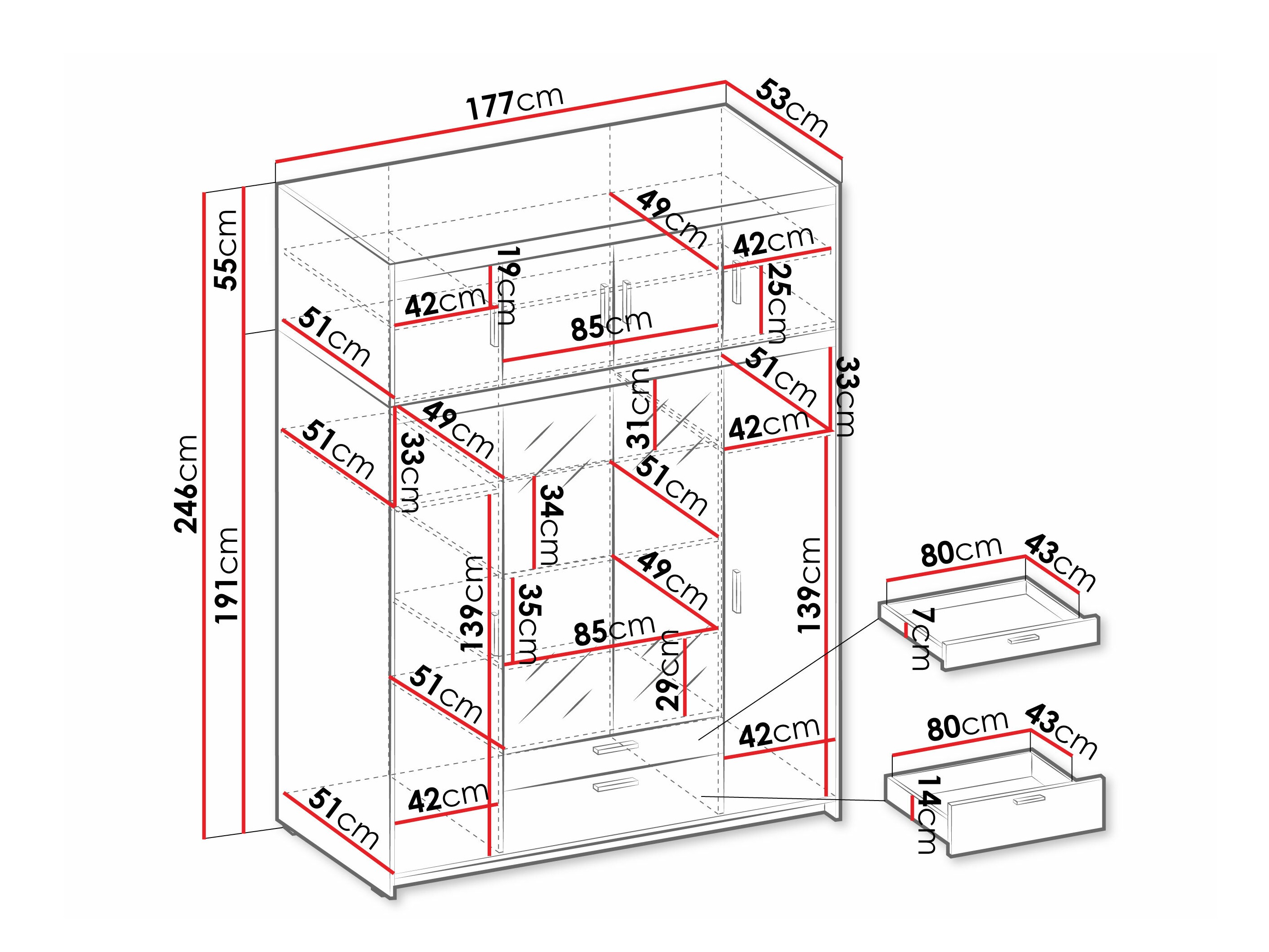 Belle garde-robe avec une bonne distribution et jusqu'au plafond. Pour 1,76 m. ça va très bien. Les mécanismes et les charnières fonctionnent très bien.