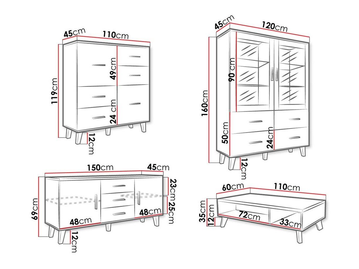 Les meubles de cette collection ont été conçus dans un souci de confort au quotidien. Le design est donc basé sur les éléments essentiels de la vie de tous les jours: étagères et tiroirs spacieux, armoires closes spacieuses. Tous les meubles sont montés sur des pieds de12 cm, ce qui donne à chacun d'eux une impression optique de légèreté, tandis que les poignées allongées ajoutent au design minimaliste. Les meubles sont empreints de l'esthétique nordique, mais ils s'adaptent aussi parfaitement bien aux éléments modernes tels que les étagères vitrées, entièrement vitrées, qui peuvent contenir de la vaisselle ou des souvenirs de famille.