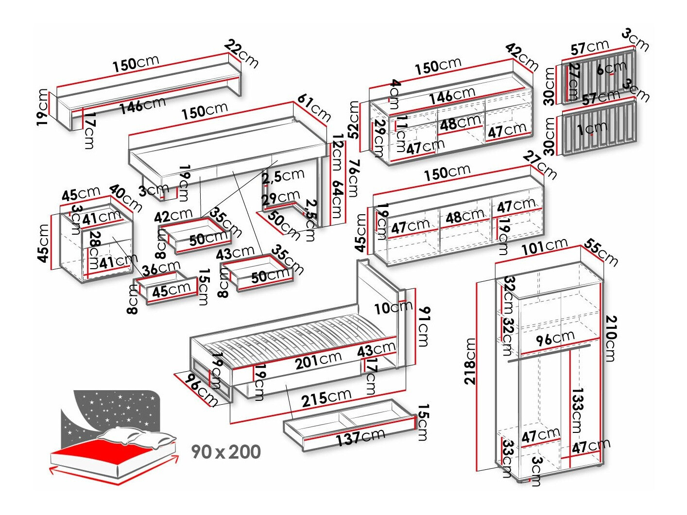 - 90 x 200 cm