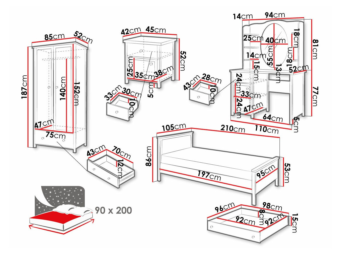 - 90 x 200 cm