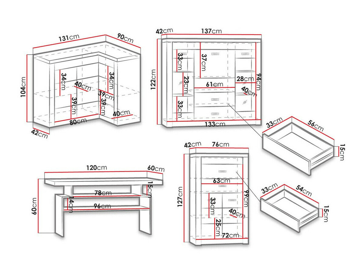 127 x 76 x 42; 104 x 131 x 42 cm