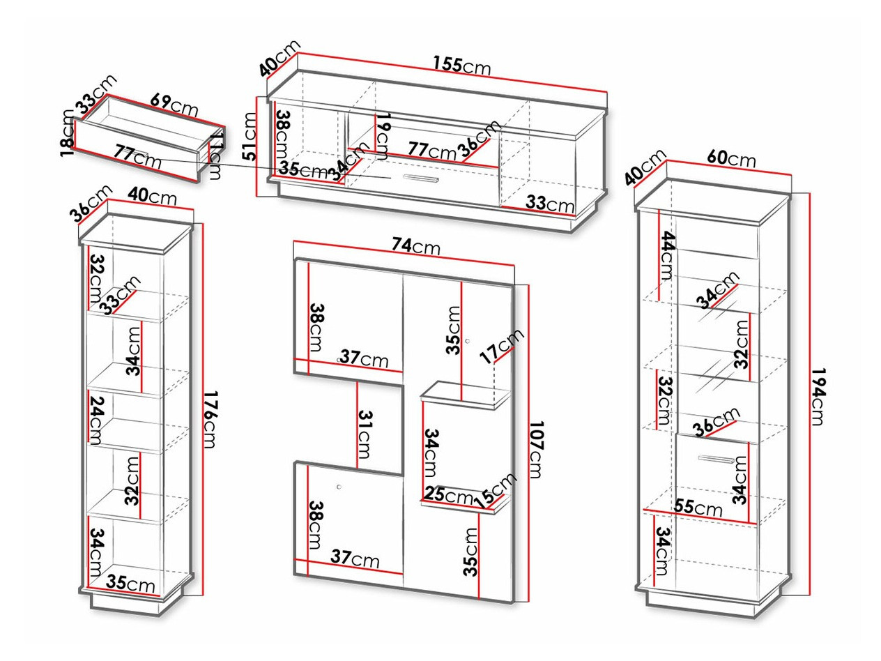 Cette collection de meubles contribuera à créer une atmosphère cosy et chaleureuse dans votre maison. Les façades décoratives et les poignées en plastique noir ajoutent du caractère au meuble et donnent du charme à l'ensemble de l'intérieur. Le mobilier de la vitrine est en verre trempé, plus sûr et plus résistant que le verre ordinaire traité thermiquement. Les panneaux MDF sont également utilisés dans la production de meubles, car ils sont très résistants à la rupture et à la flexion. Pour plus de confort dans la pièce, les meubles avec éclairage LED peuvent être commandés séparément, améliorant encore la chaleur et l'ambiance de votre maison.