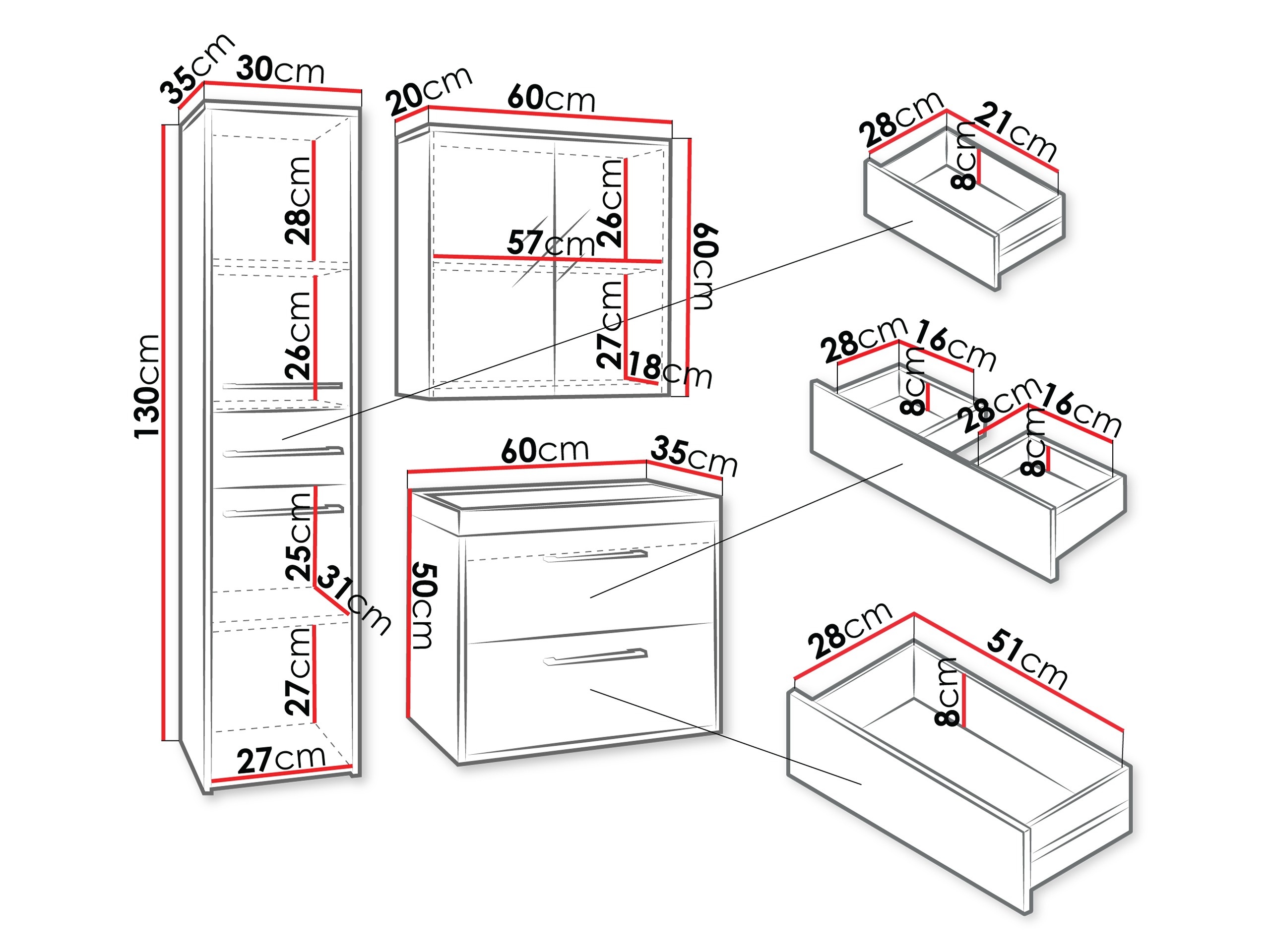 130 x 30 x 35; 60 x 60 x 20 cm