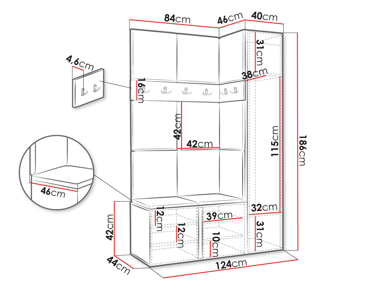 186 cm  124 cm  46 cm