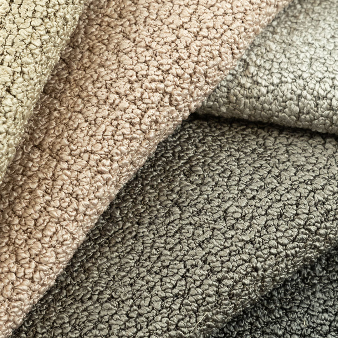 Ce tissu enchante par sa texture délicatement bouclée et sa surface douce au toucher. Il est exempt de substances allergènes. Malgré son toucher doux, le tissu est facile à entretenir grâce à un revêtement protecteur qui empêche les liquides de s'imprégner rapidement. Les liquides renversés forment de petites gouttelettes qui peuvent être essuyées sans effort à l'aide d'un chiffon propre. Afin de préserver l'aspect et les propriétés du tissu, il est recommandé de nettoyer toute la surface en utilisant uniquement des produits de nettoyage doux spécialement conçus pour les tissus d'ameublement.